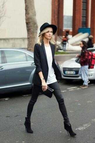 4.白色衬衫搭配黑色皮衣和铅笔裤,加上一顶小礼帽,简约的黑白配个性又不失潮感,而围巾的混搭也令人眼前一亮。