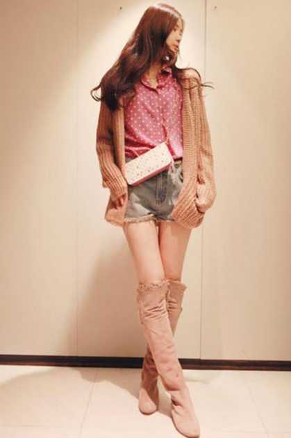搭配方案一:长款针织外套+牛仔热裤+绒面长靴